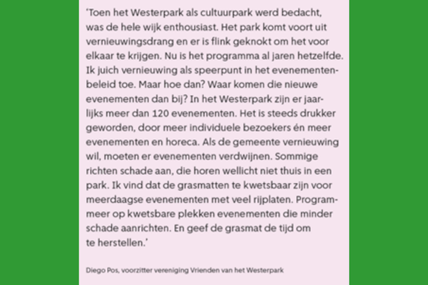 In het visiedocument van de wethouder wordt de mening van de Vrienden van het Westerpark geciteerd. Wij waren betrokken bij de meningsvorming van die visie. Daarbij zijn we uitgebreid aan